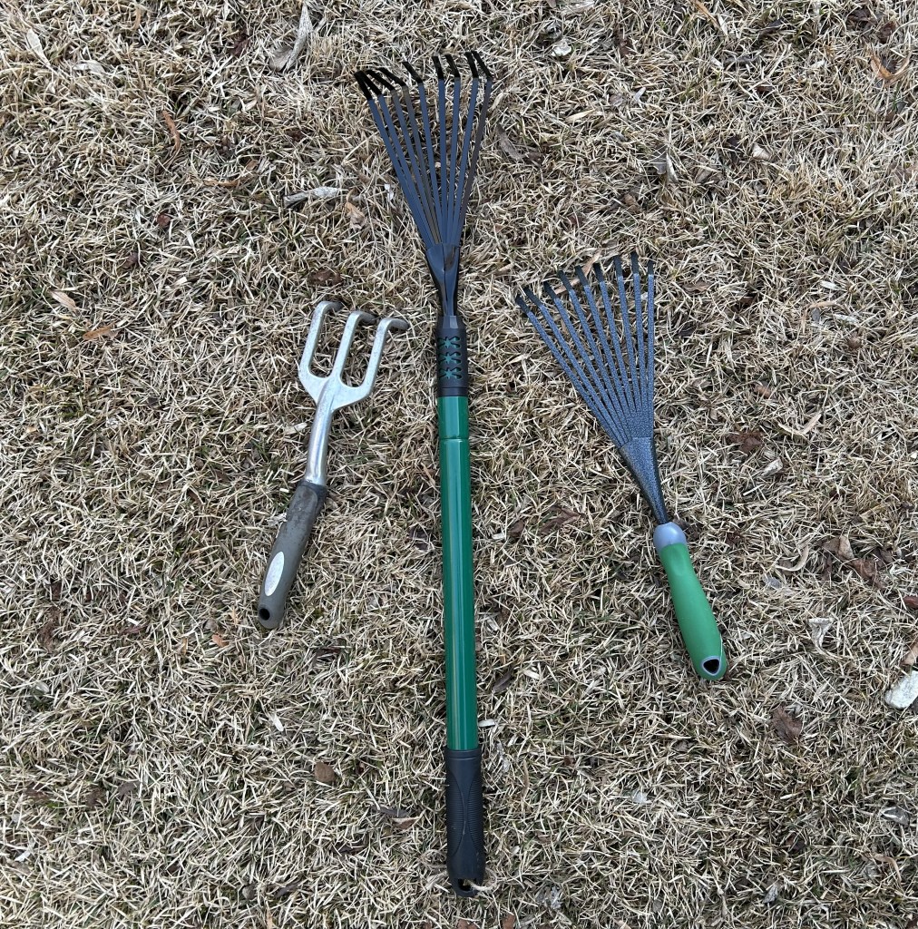 I purchased my telescoping mini rake (center) from Dollarama for $4 and the smaller flexible rake (right) was $5 at Walmart. Although I have used other tools like this in the past, both tools photographed were purchased this spring so I can’t say much about the quality of this exact tool so stay tuned.