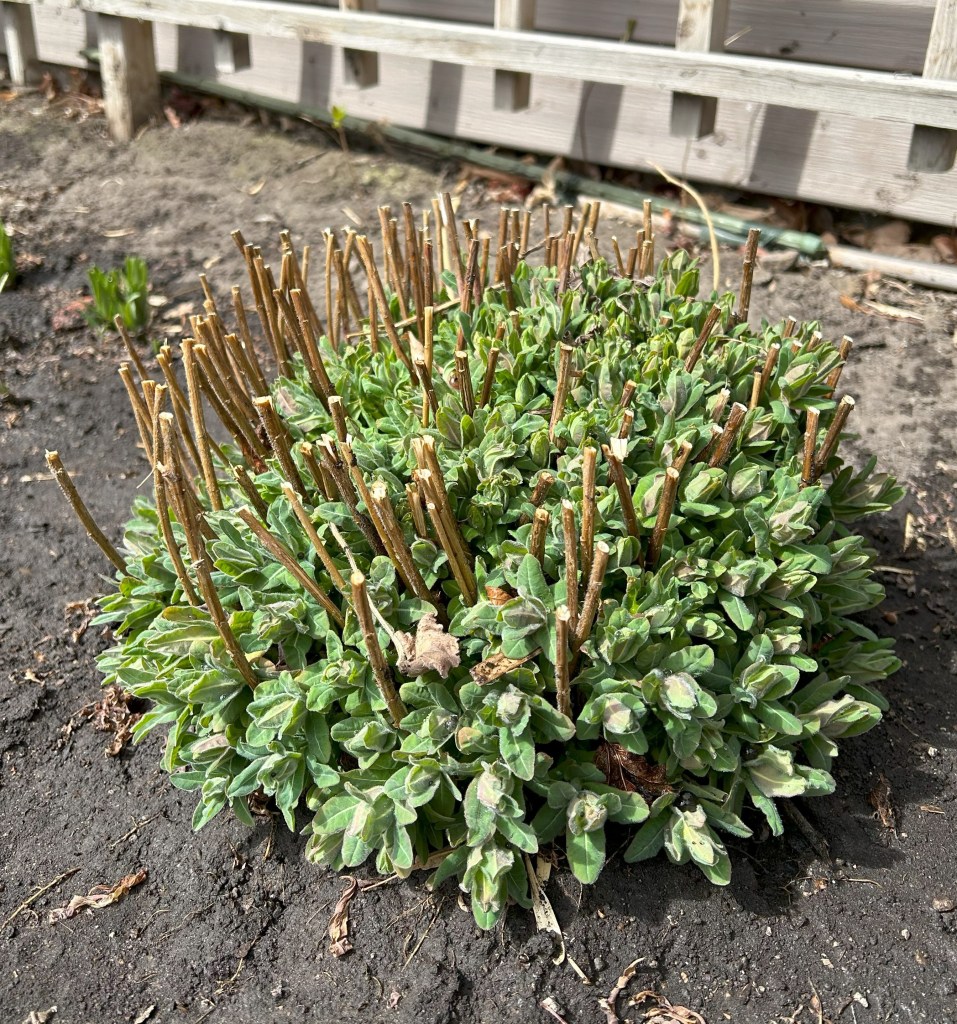 Wood spurge in early spring, after a heavy trim.